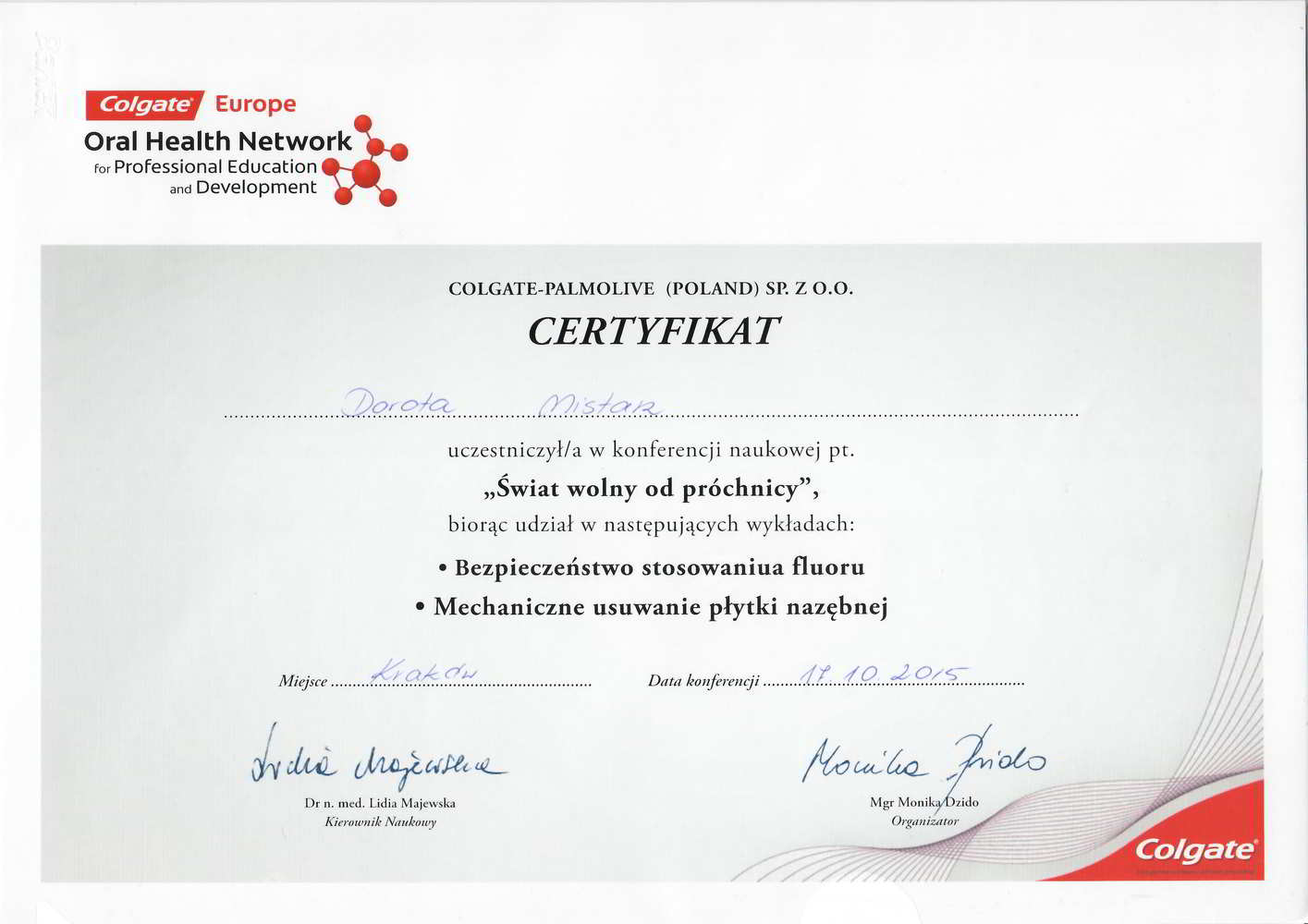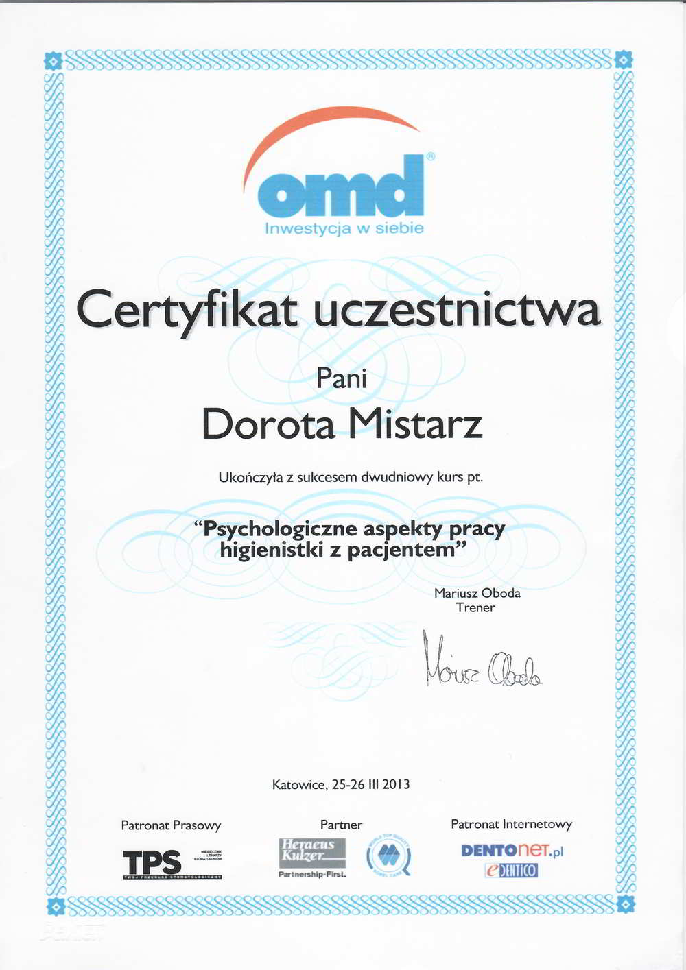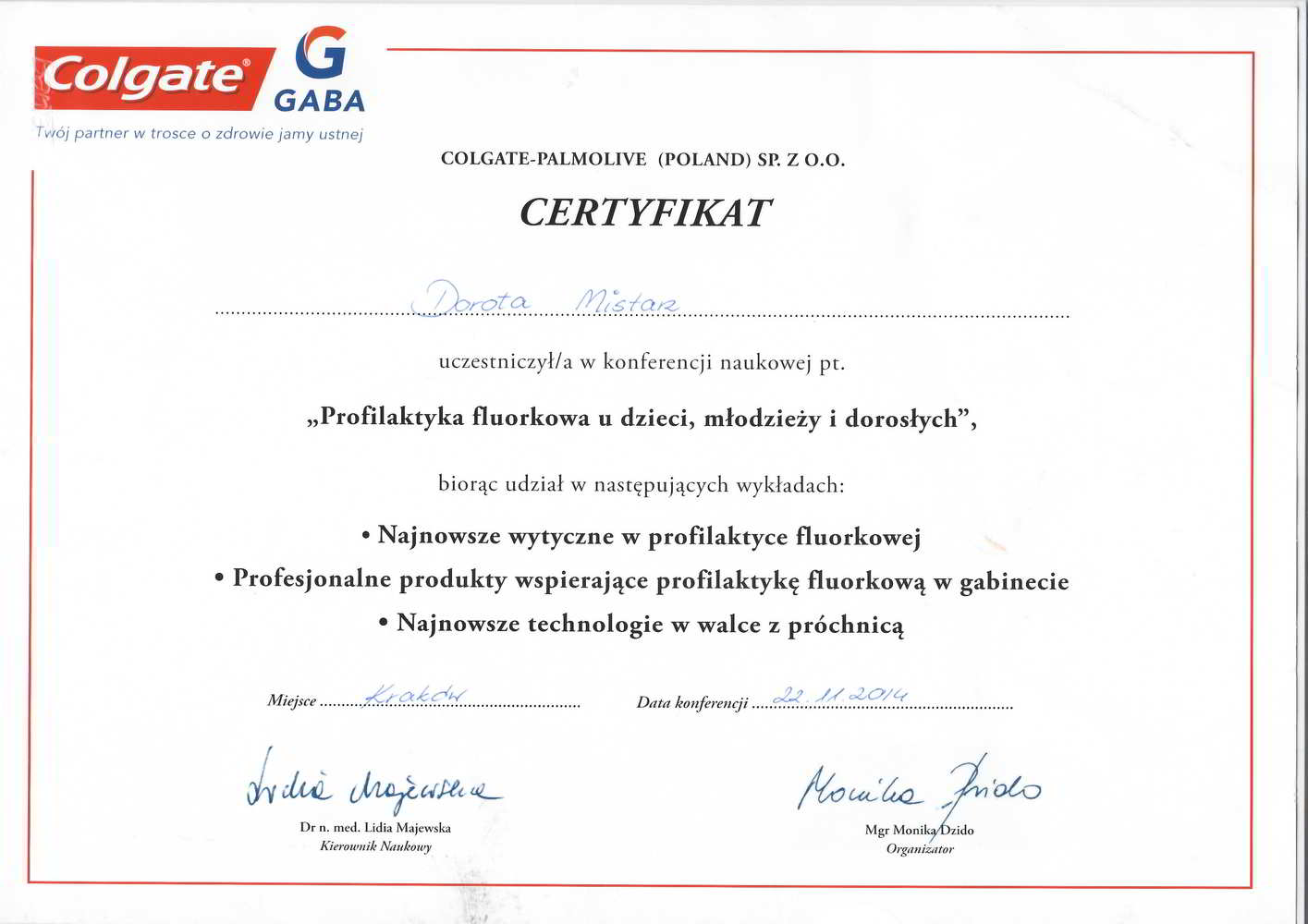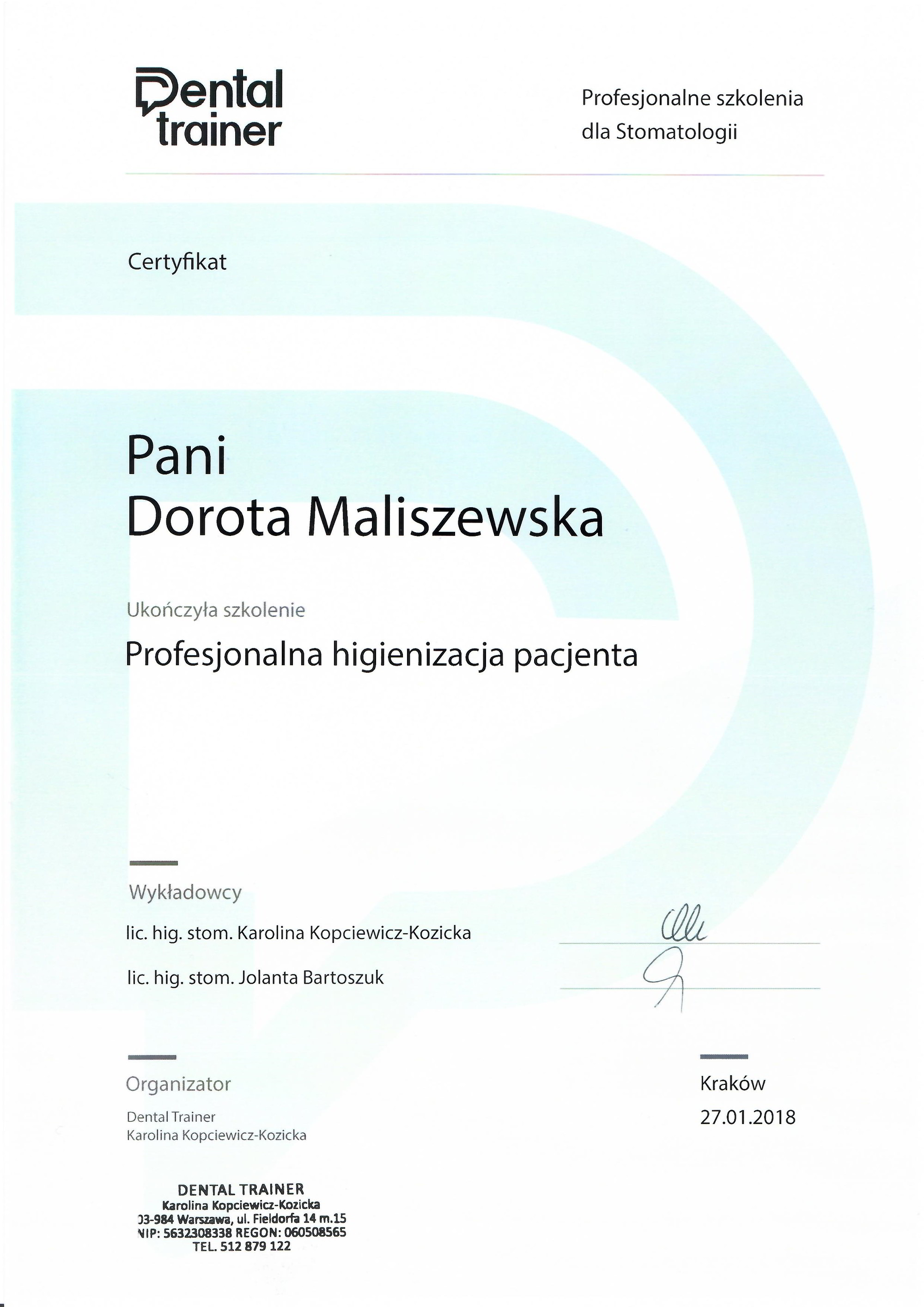 Absolwentka Medycznego Studium Zawodowego. Związana ze stomatologia od 10 lat. Stale poszerza swoje zawodowe kompetencje uczestnicząc w szkoleniach oraz kursach z zakresu stomatologii i higienizacji. Motywacją do dalszego rozwoju zawodowego jest obserwowanie znakomitych efektów leczenia oraz zadowoleni pacjenci. Miła, energiczna i bardzo otwarta osoba.Lubi aktywnie spędzać czas wolny.